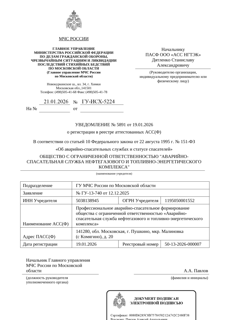 Уведомление о регистрации в реестра аттестованных АСС (Ф) ГУ МЧС России